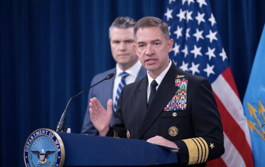El almirante Brad Cooper habla con los medios de comunicación durante una rueda de prensa con el secretario de Defensa, Pete Hegseth (izquierda), en el Pentágono, en Washington, el 16 de abril de 2026.